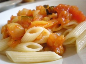 Iako vrijeme ovih dana ne pokazuje baš neko ljetno lice, ljetnog povrća je pun vrt pa u nedostatku ideje što skuhati najbolje je uputiti se baš u vrt i ideja će doći sama po sebi. Naravno, ako si to možete priuštiti. A ako ne, dobra je opcija također opelješiti baku, mamu ili svekrvu za kakvo ukusno svježe povrće ili u krajnjem slučaju kupiti. Ehh što se može…ručak se skuhati mora ;) Ovakav jednostavan umak za tjesteninu je odlično rješenje za ručak na brzinu. Sve namirnice zahtjevaju vrlo kratko vrijeme termičke obrade pa tako u malo vremena možete zgotoviti doista zdrav i ukusan obrok. Ovo je u biti neka vrst poznatog francuskog specijaliteta Ratatouille samo što sam u ovom receptu patliđane zamijenila tikvicama i ispalo je stvarno super – pravi brzi ljetni ručak